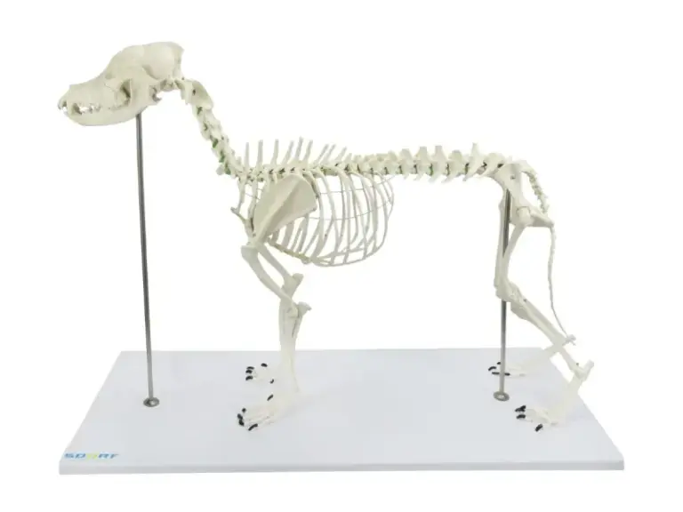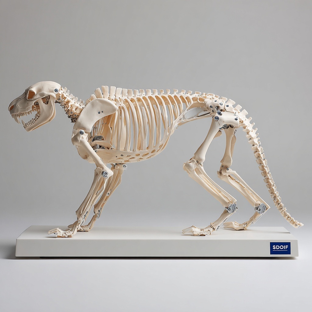 Os membros dianteiros e traseiros são representados com todos os ossos relevantes, permitindo que os alunos entendam a mecânica do movimento. A base plástica que suporta o modelo é projetada para garantir a estabilidade durante as apresentações, evitando quedas e danos. Essa característica é fundamental para garantir a longevidade do esqueleto em ambientes de ensino.